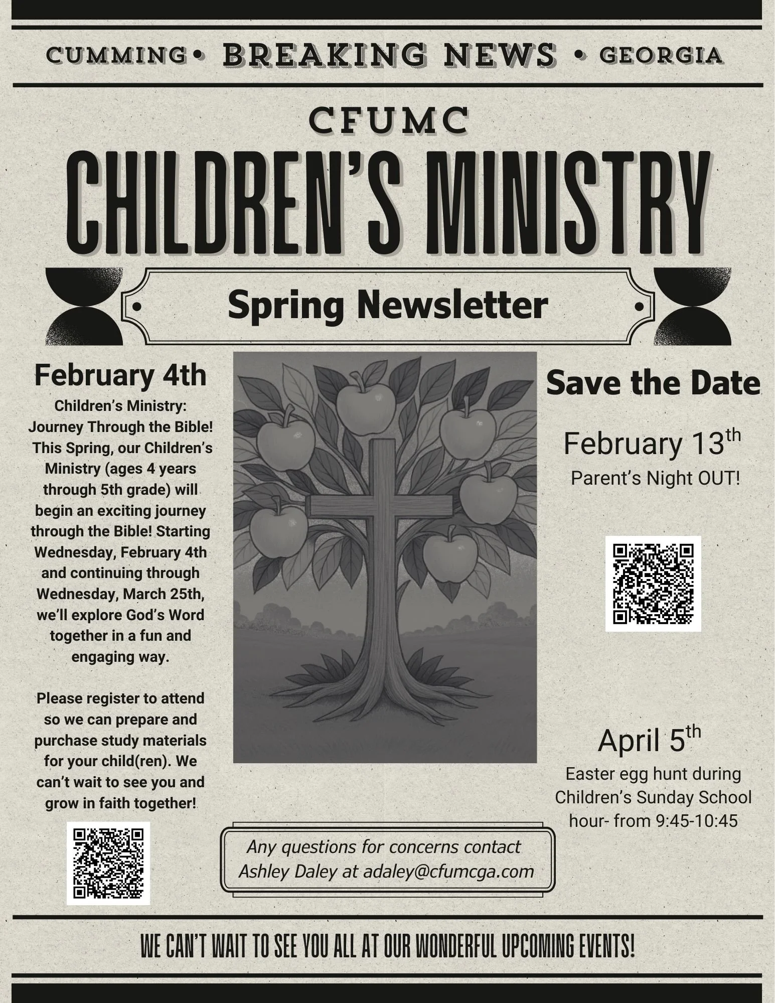 The Children’s Ministry at CFUMC is dedicated to guiding our children toward a deeper relationship with God through a Bible-focused curriculum that nurtures faith and understanding. We strive to create an environment where learning about God’s Word is both meaningful and engaging. In addition to our regular programs, we host a variety of activities throughout the year for children and their parents, fostering fellowship and community. If you have any questions or would like more information, please don’t hesitate to reach out. Thank you for being an important part of our wonderful CFUMC family!